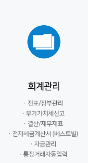 일반전표입력 및 매입매출전표 입력을 토대로 부가가치세 긴고 및 결산자료입력을 통한 재무제표 자동작성이 가능하며, 전자(세금)계산서, 국세청사업용 신용카드, 현금영수증, 통장거래, 매입신용카드등 일괄 스크래핑을 통한 회계전표처리까지 원스톱 방식으로 처리할 수 있는 기능 집약적으로 프로그램을 구현합니다.