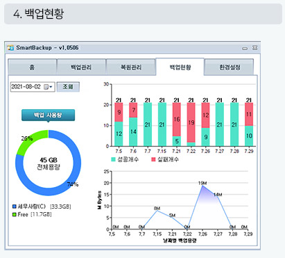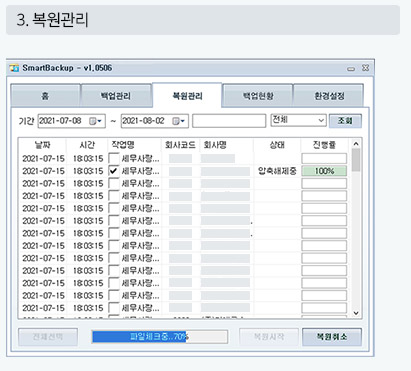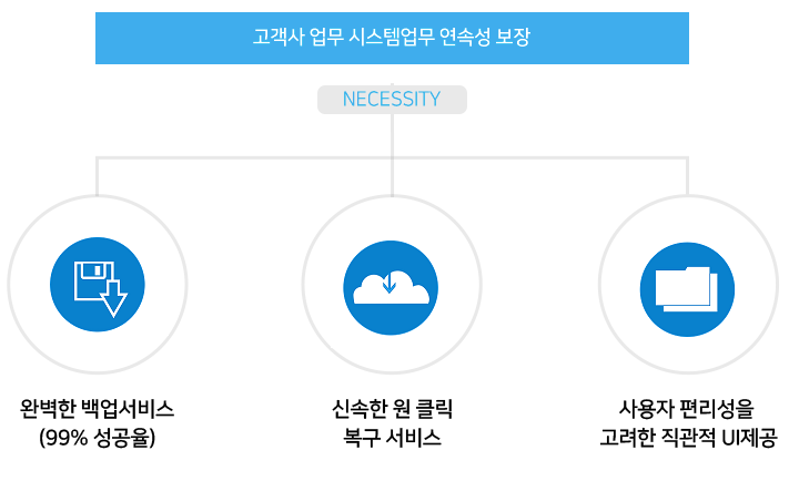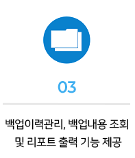 | 03 | 복구처리 | 백업 리스트에서 클릭 한번으로 간단한 복구처리 |