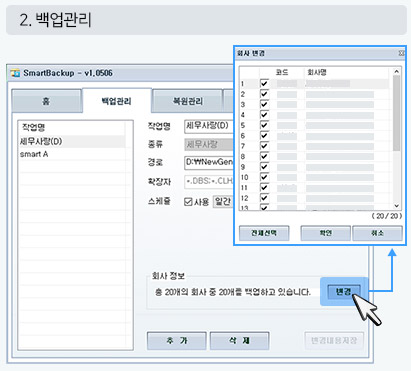 전체 또는 선택 백업 가능, 타 회계프로그램 Data 및 일반문서 백업지원 |